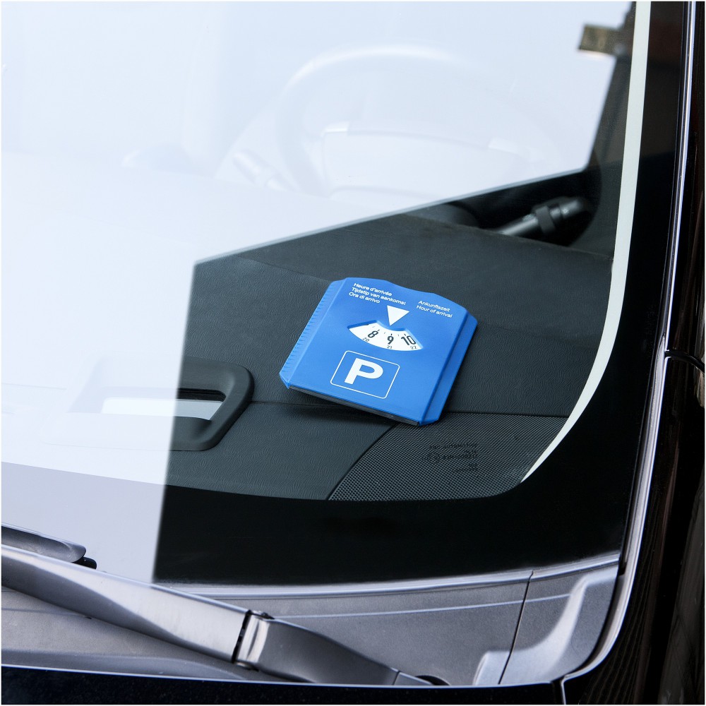 Parkolótárcsa jégkaparóval, gumitörlővel, érmetartóval és a gumi futófelületét ellenőrző mérővel. A lemez hátulján nagy fehér felület a logóknak. A lemezen az Érkezési idő szövegezés hollandul, angolul, franciául, németül és olaszul is megjelenik. A szabályok helytől függően változhatnak.