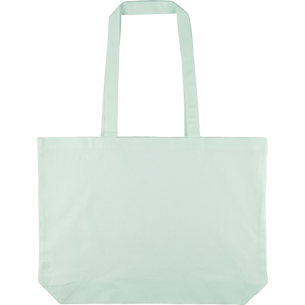 Oeko-Tex minősítésű, 140 g/m2 pamutból készült bevásárlótáska 10 cm-es talppal és 70 cm hosszúságú, 2,5 cm szélességű hosszú fülekkel. Pasztell színekben elérhető: PMS 9562U (zöld), 162U (narancs), 317U (kék) és 522U (lila). Oeko-Tex címkével ellátva.