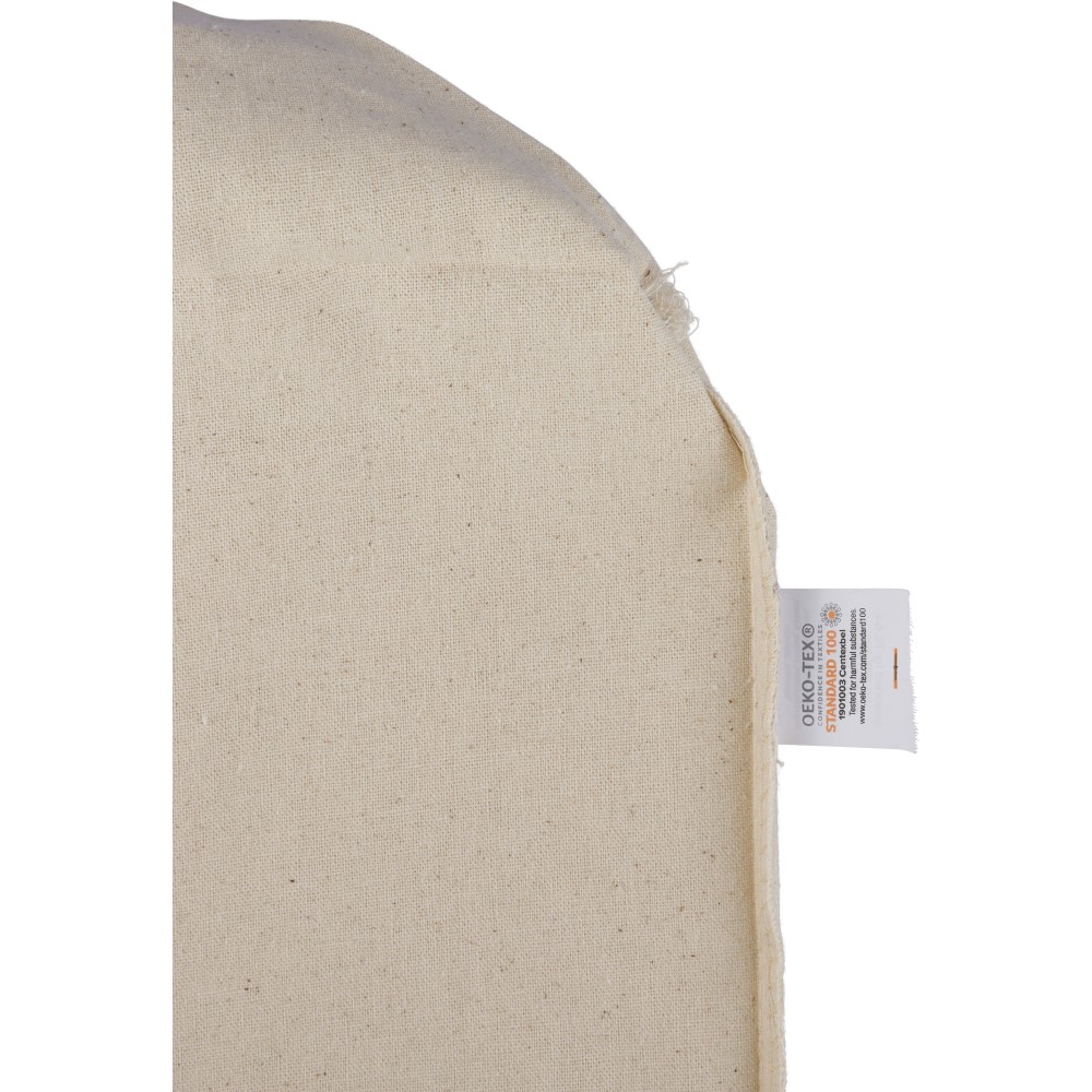 Oeko-Tex minősítésű, 180 g/m2 pamutból készült natúr színű bevásárlótáska D-alakú talppal, 43 × 34 × 13 cm méretben, 67 cm hosszúságú és 3 cm szélességű fülekkel. Oeko-Tex címkével ellátva.