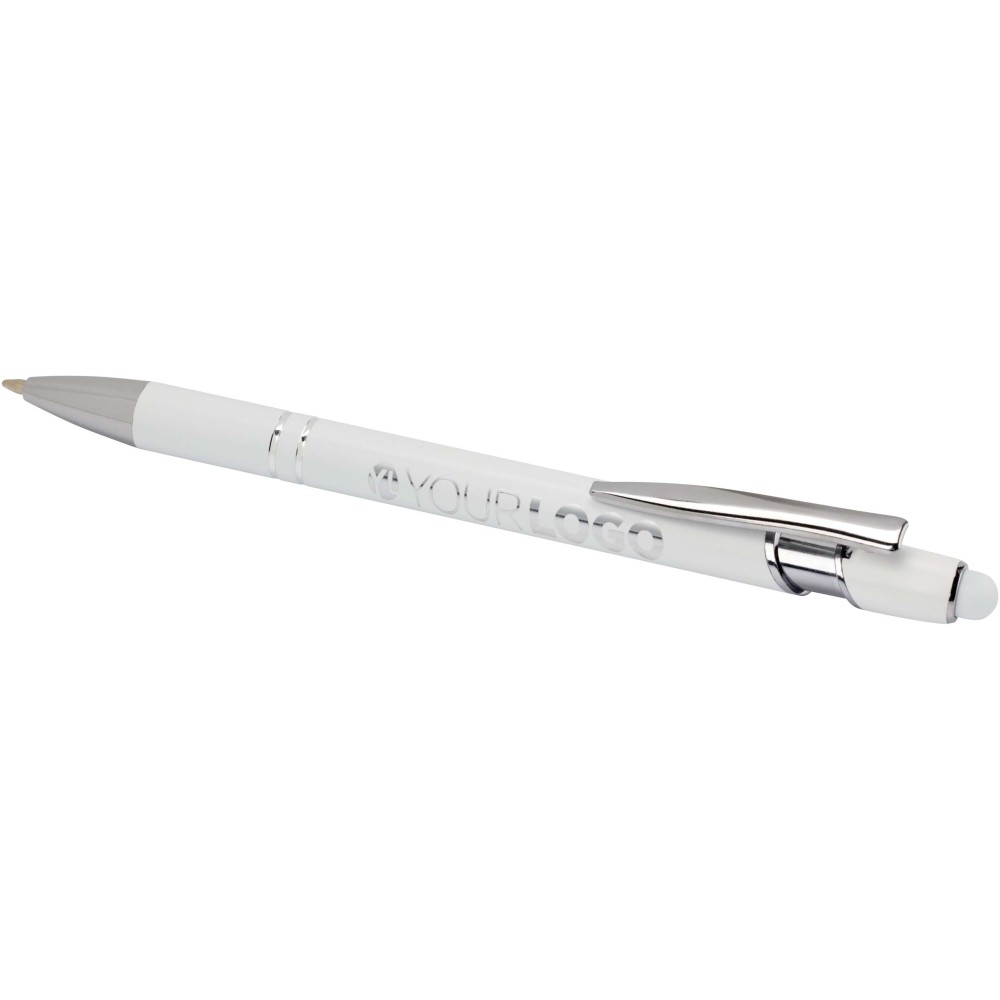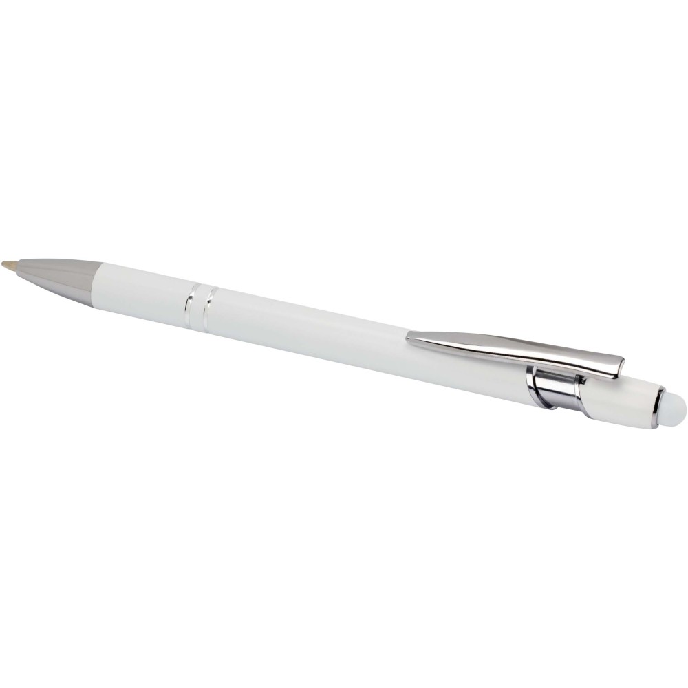 Kish golyóstoll ezüst színben. A toll teste újrahasznosított alumíniumból, az érintőceruza pedig szilikonból készült, így érintőképernyős eszközökhöz is használható. Az újrahasznosított alumínium csökkenti a hulladéklerakók terhelését, segít megőrizni a természeti erőforrásokat, és célja az üvegházhatású gázok kibocsátásának mérséklése. Tinta színe: kék. Íráshossz: 800 méter. Tollhegy mérete: 1,0 mm.