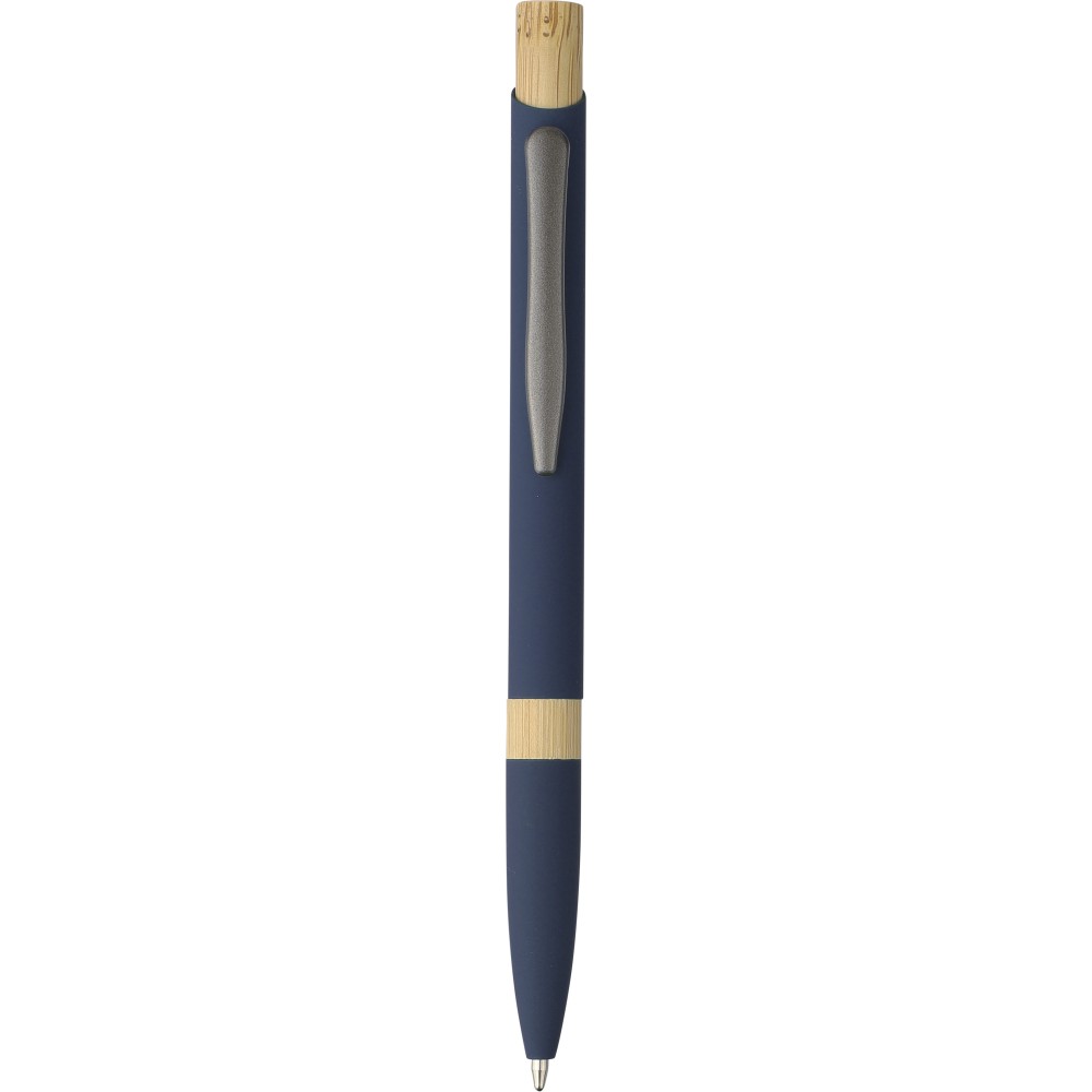 Golyóstoll újrahasznosított alumíniumból, gumírozott bevonattal, bambusz nyomógombbal és bambusz gyűrűvel a tolltesten. Kék tollbetéttel. A tollhegy vastagsága 1.0 mm, íráshossz: kb. 800 méter. Az újrahasznosított anyagra utaló logó a tollra van gravírozva.