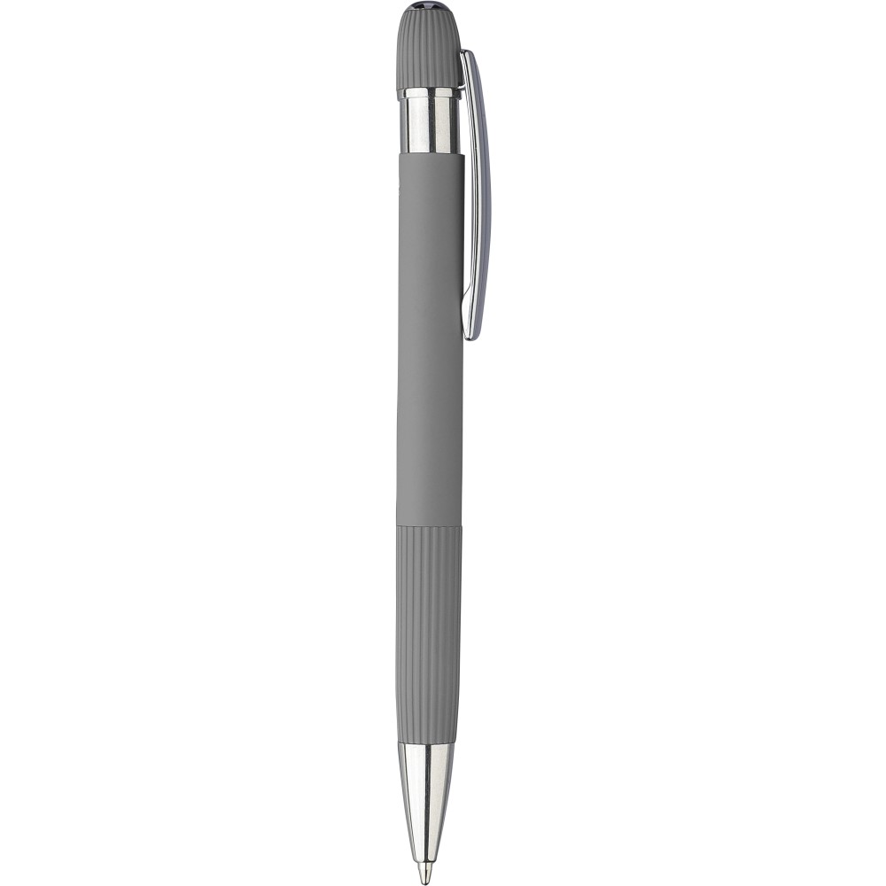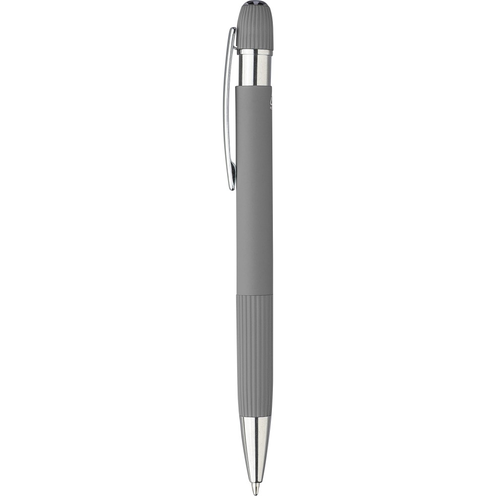 Újrahasznosított alumínium golyóstoll gumírozott felülettel. Csíkos részletekkel a markolaton és a tetején, krómozott műanyag heggyel és fém klipsszel ellátott nyomógombbal. Lézergravírozott újrahasznosított logóval. Kék tintával.