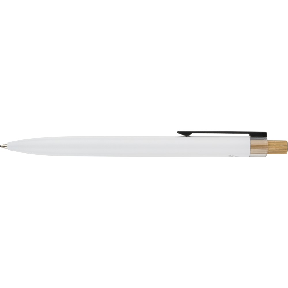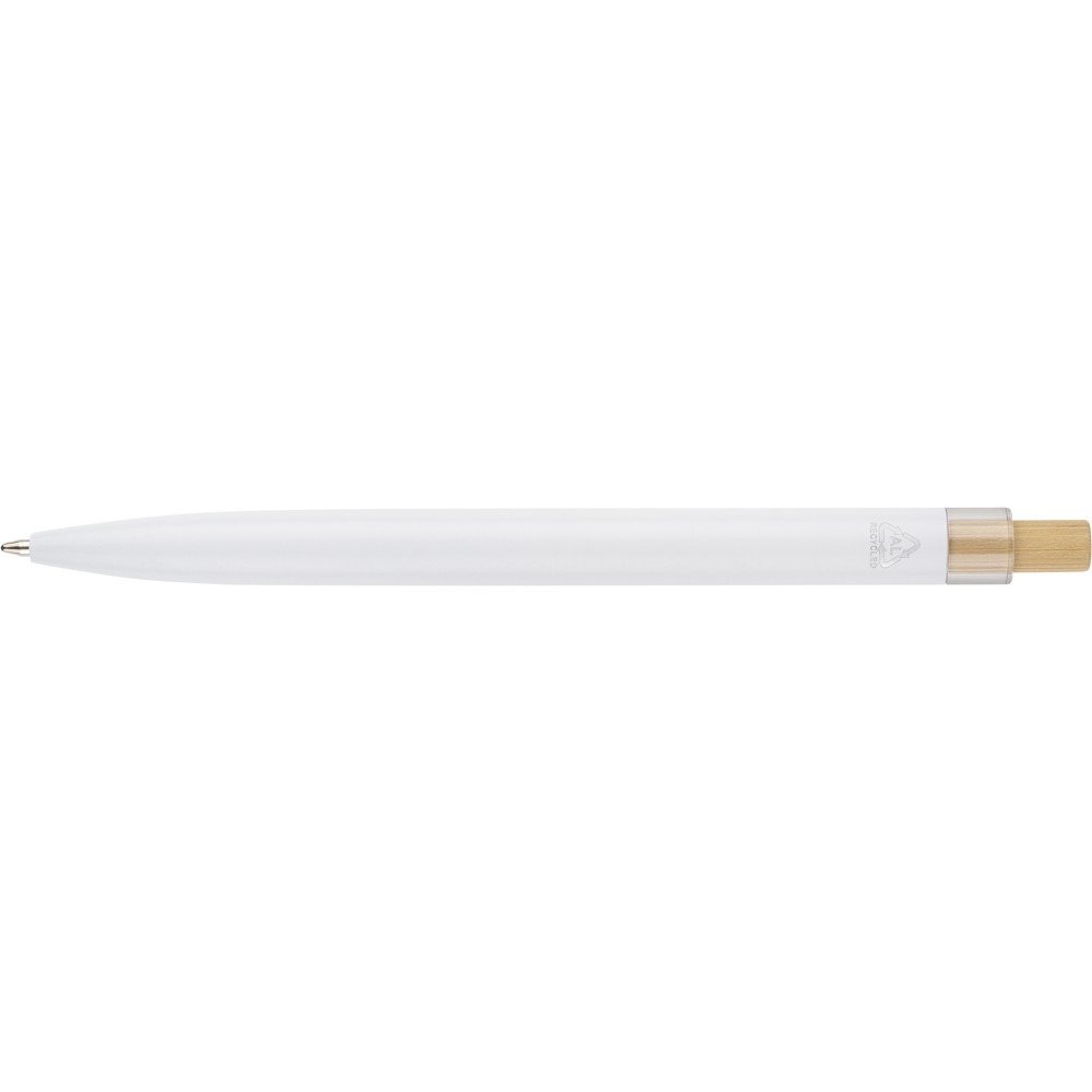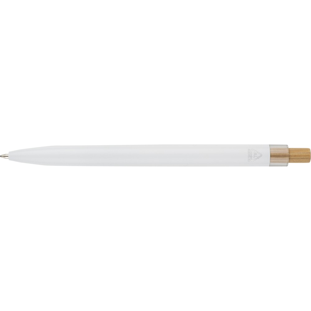 Újrahasznosított alumíniumból készült, lakkozott, nyomógombos golyóstoll bambusz nyomógombbal, rPET díszítéssel és fém klippel. A tolltesten gravírozott recycled (újrahasznosított) alapanyagra utaló logó található. Megközelítőleg 700 méter íráshossz, kék tollbetéttel.
