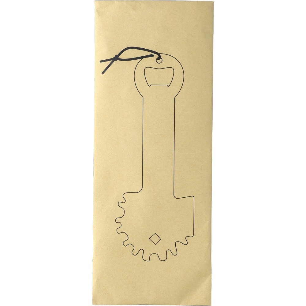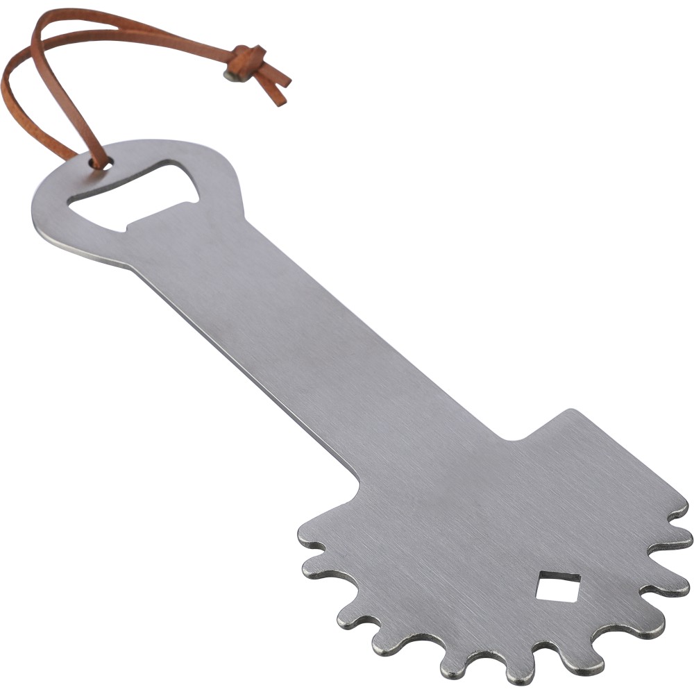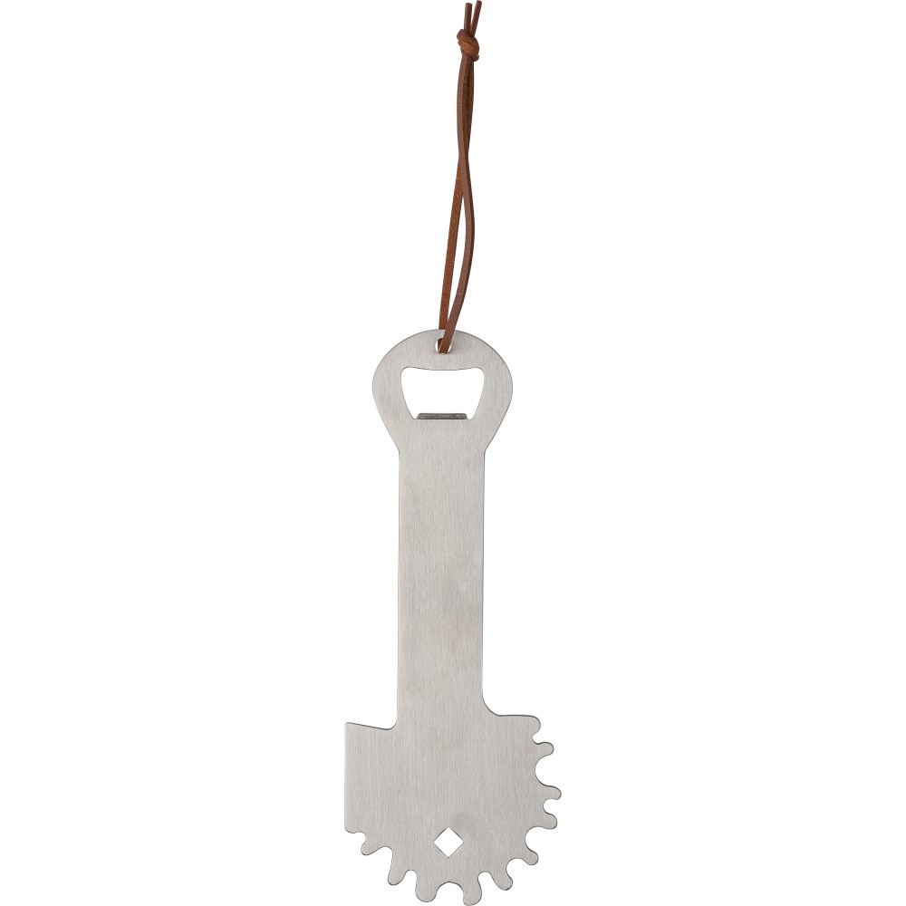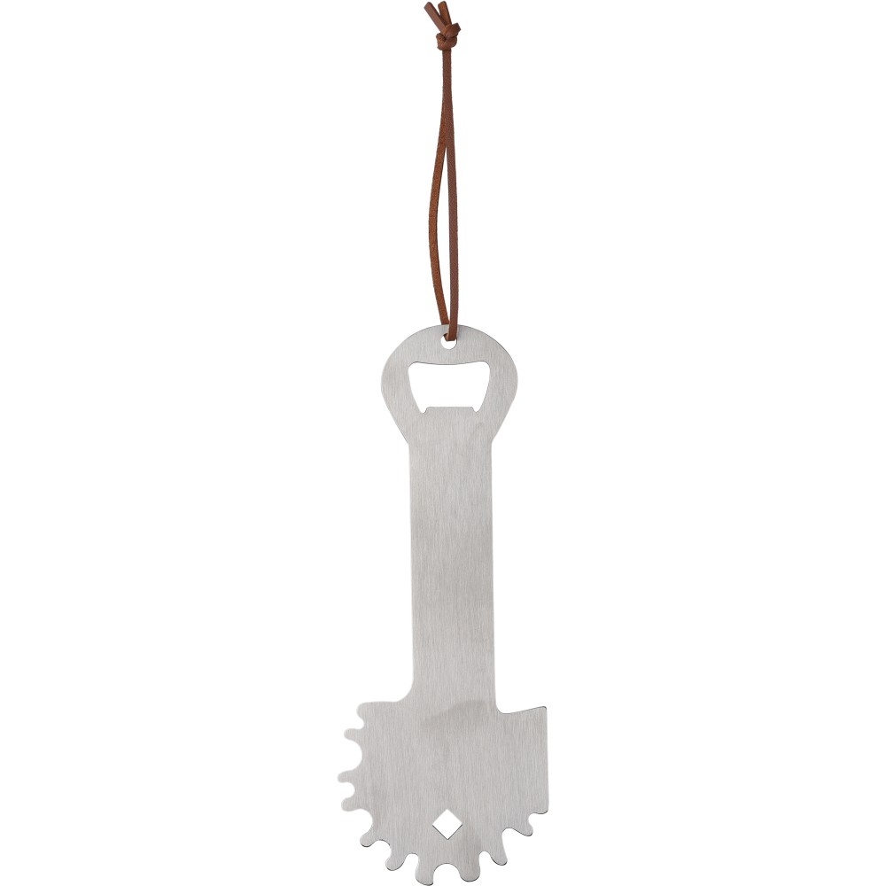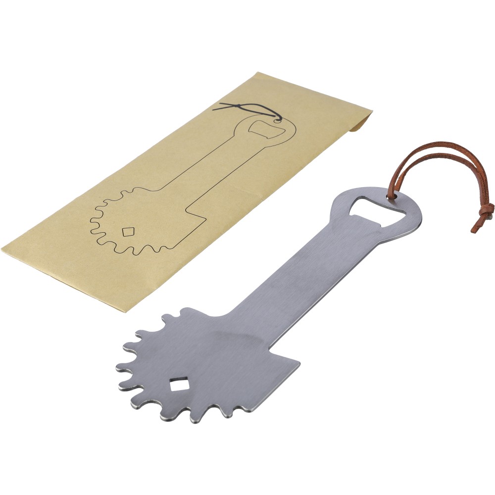 Rozsdamentes acél barbecue tiszító beépített üvegnyitóval. PU akasztópánttal rendelkezik. Csomagolása kraftpapír tasak.