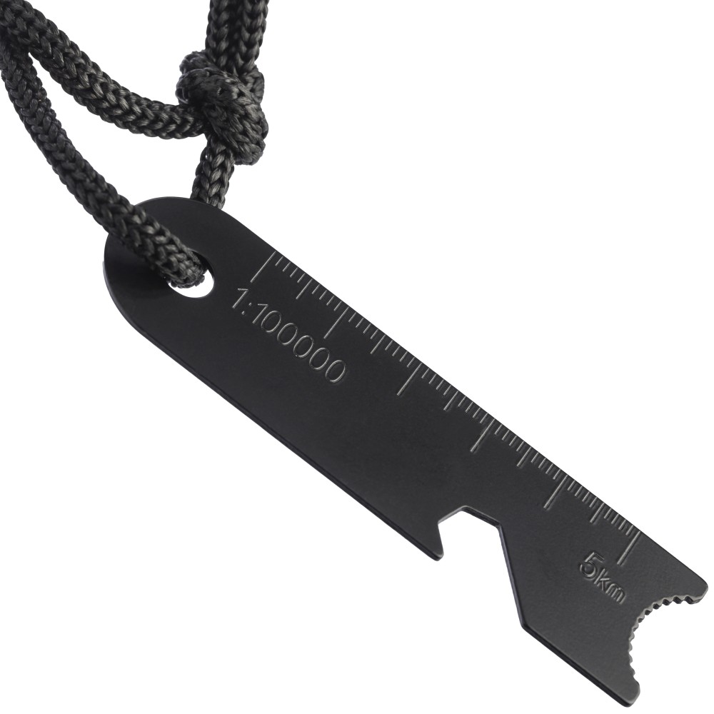 Rozsdamentes acél tűzgyújtó fenyő nyéllel és poliészter pánttal, mely csatlakoztatja a kaparóeszközt és a gyújtópálcát. A multifunkciós kaparóeszköz üvegnyitót, vonalzót és hex-kulcsot tartalmaz. Csomagolása barna papírdoboz.