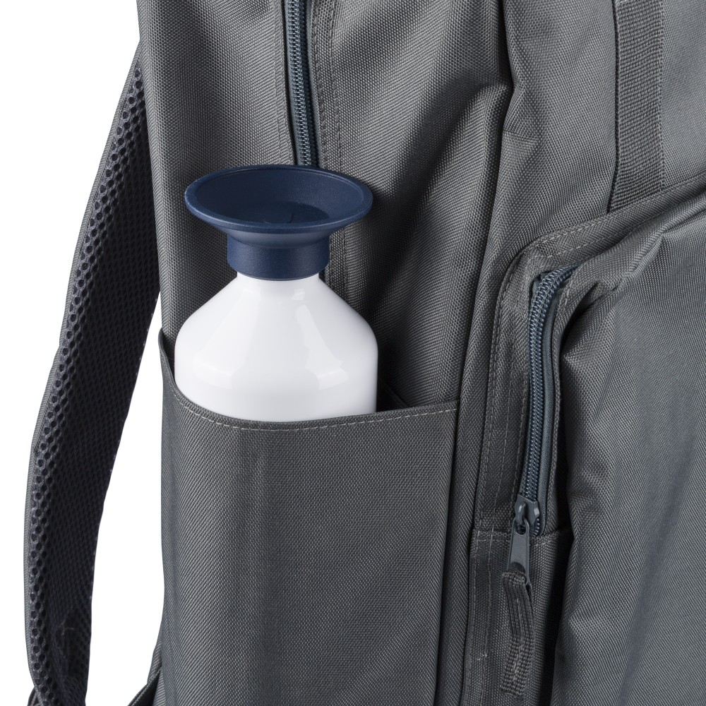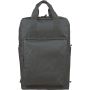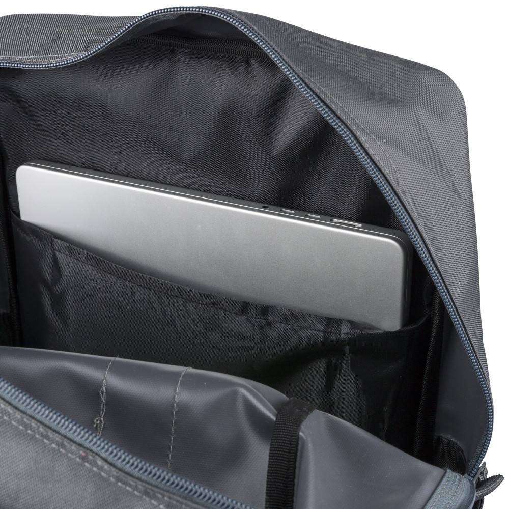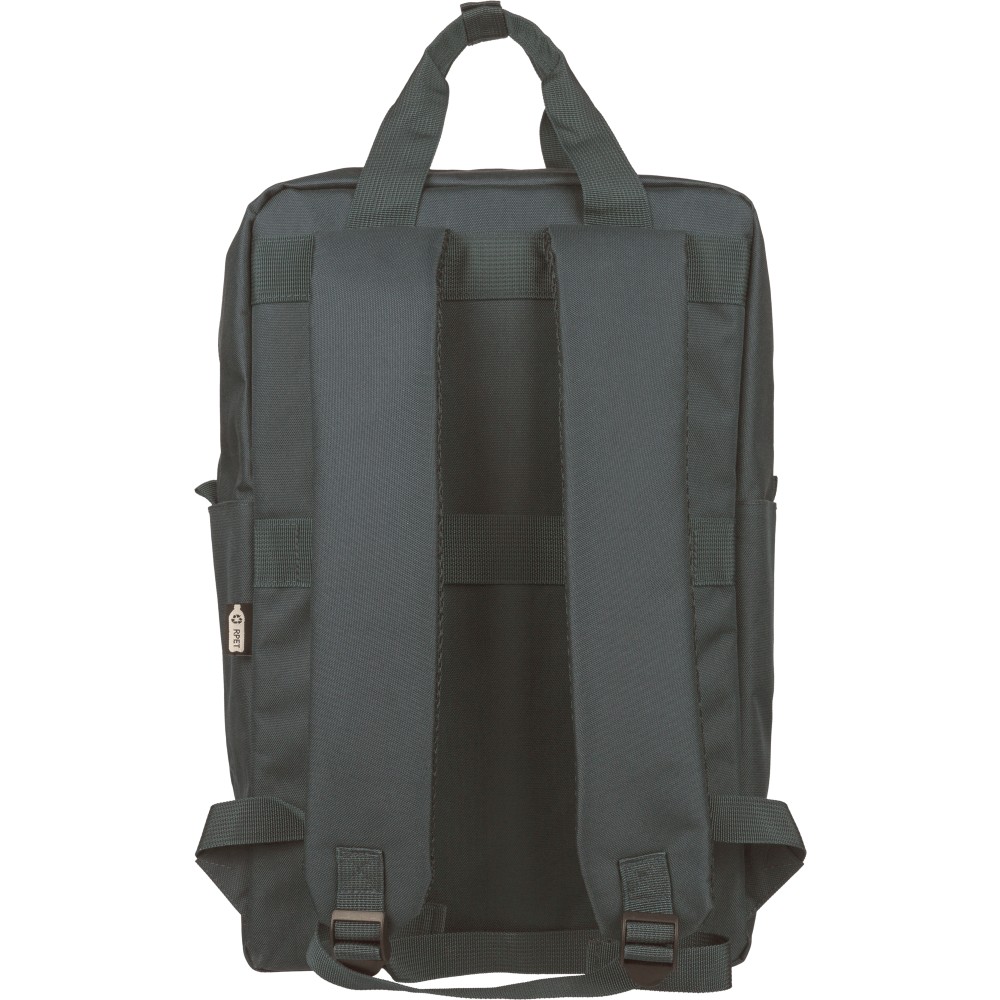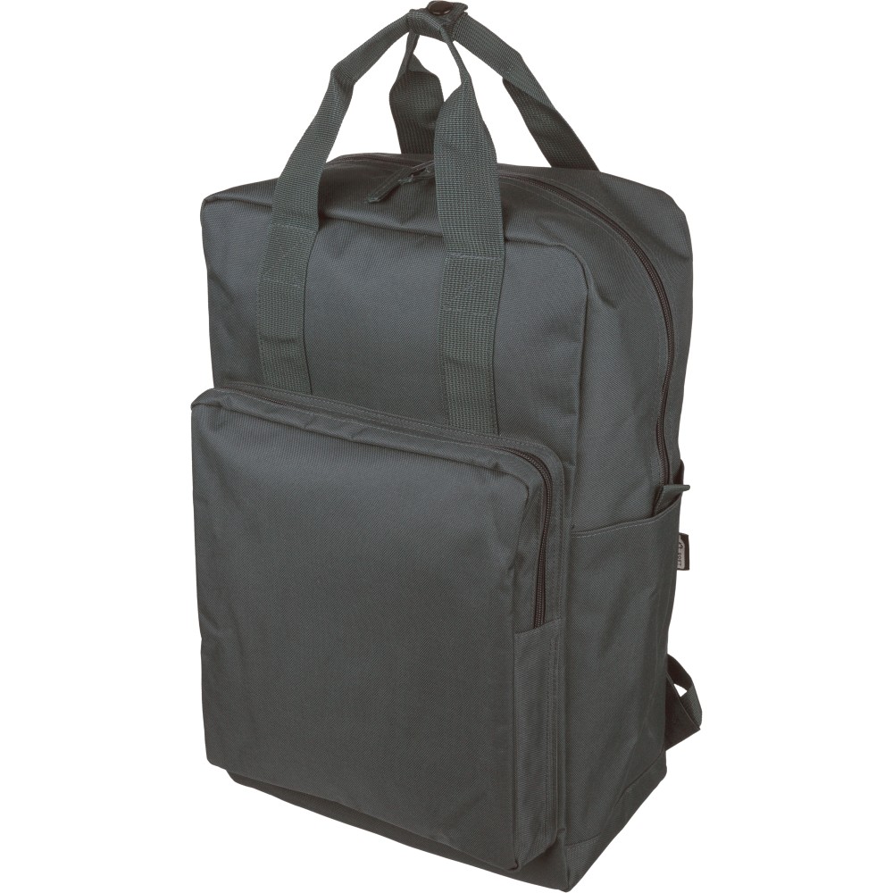 Újrahasznosított 900D poliészterből készült hátizsák, 210D béléssel és rPET címkével. Tágas fő rekesszel rendelkezik, 16?-os laptop számára kialakított külön zsebbel, elülső rekesszel, két oldalzsebbel, valamint bőröndre rögzíthető pánttal (trolley strap). Felső fogantyúi gombbal összefoghatóak, vállpántjai szellőző kialakításúak a kényelmes viselet érdekében.