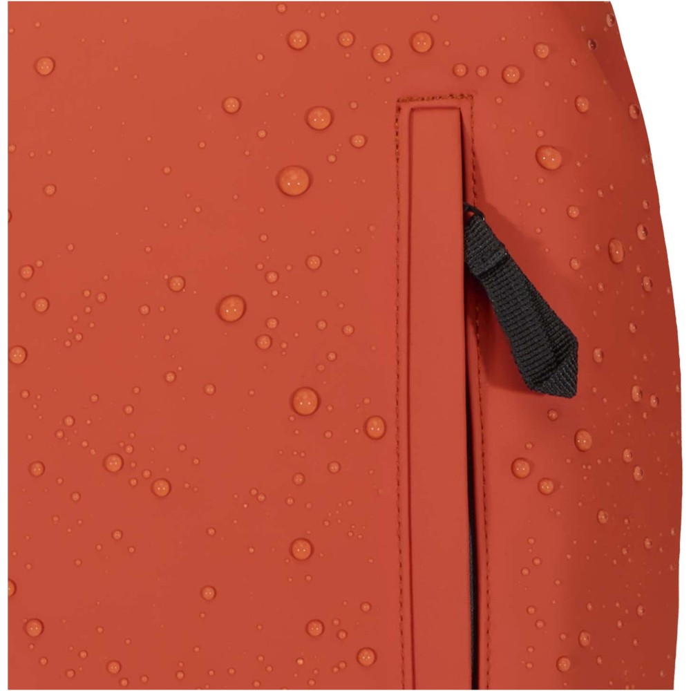 A prémium minőségű, GRS tanúsítvánnyal rendelkező újrahasznosított PU bőrből készült, színben passzoló RPET béléssel ellátott 15?-os biztonsági hátizsák garantálja az értékek védelmét és szárazon tartását útközben. A termék hátulról hozzáférhető laptoprekeszel, két letisztult oldalsó zsebbel, valamint egy vízálló cipzárral felszerelt elülső zsebbel rendelkezik. A légáteresztő hátlap biztosítja az egész napos kényelmet, így ideális választás ingázáshoz, utazáshoz vagy városi használatra. Űrtartalma: 18 liter.