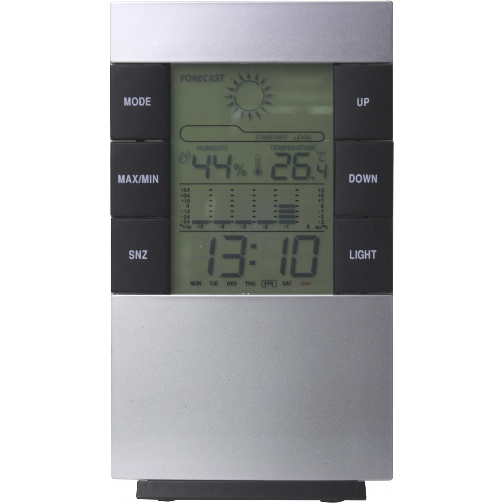 Digitális időjárásjelző állomás. Falra is szerelhető ébresztőóra, naptár, hőmérő és páratartalommérő háttérfénnyel. Az elemet tartalmazza.