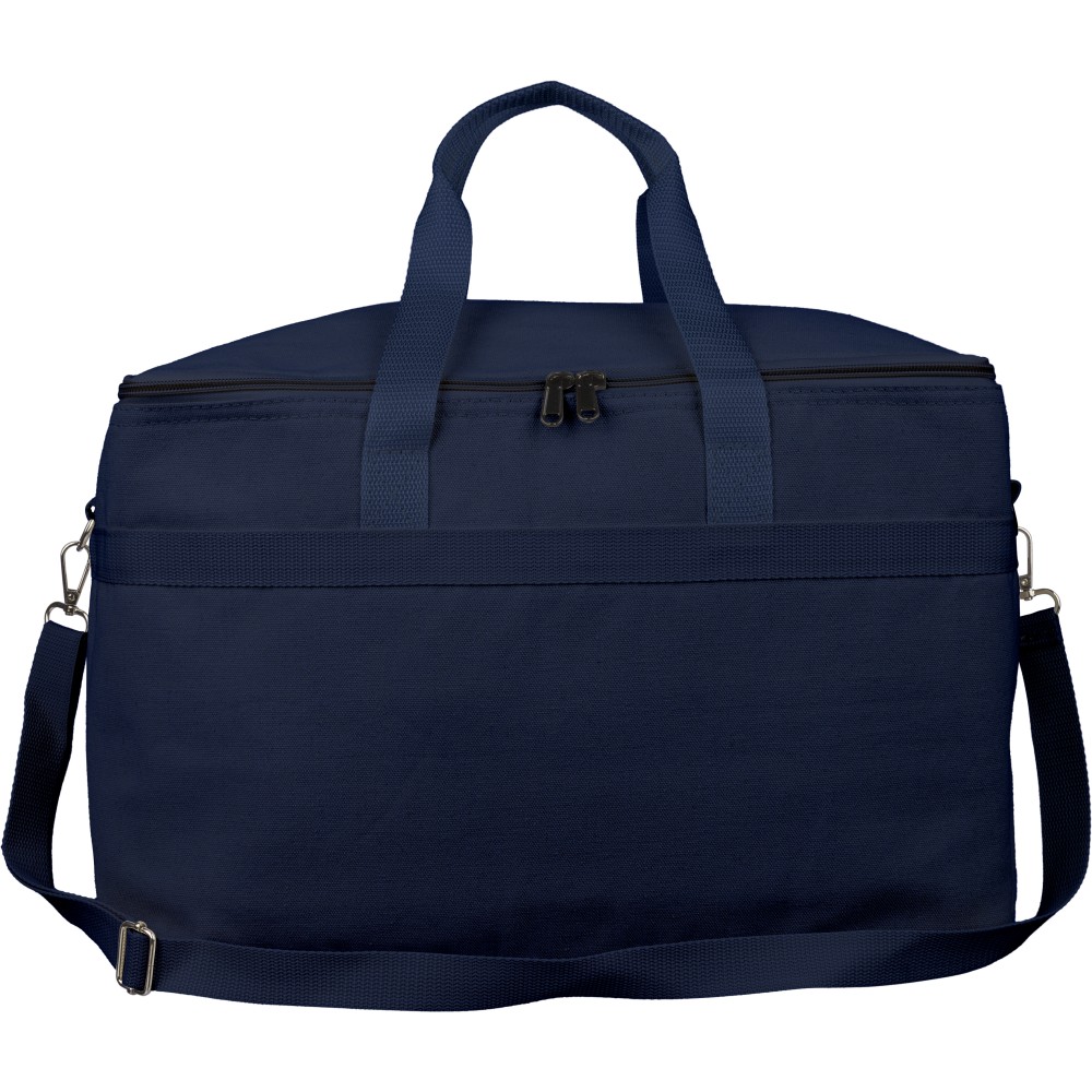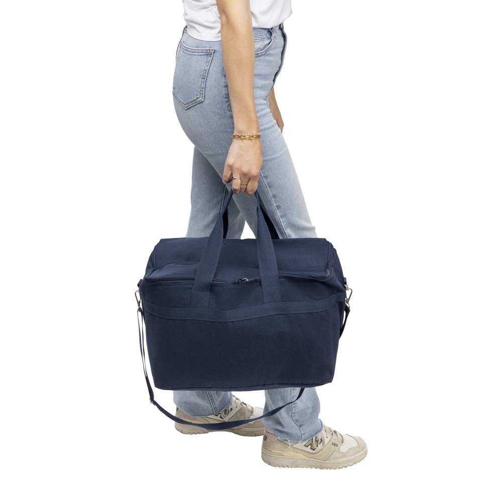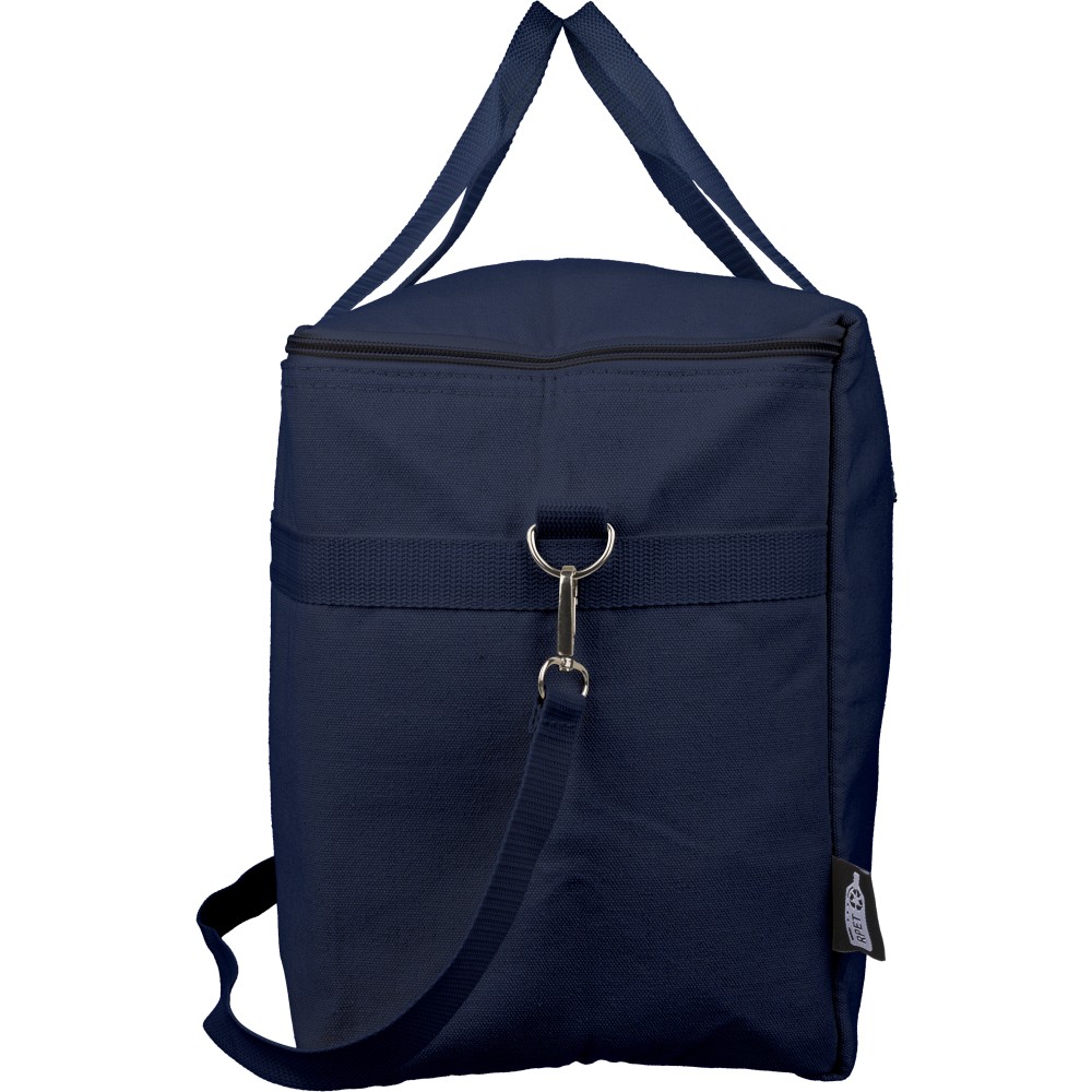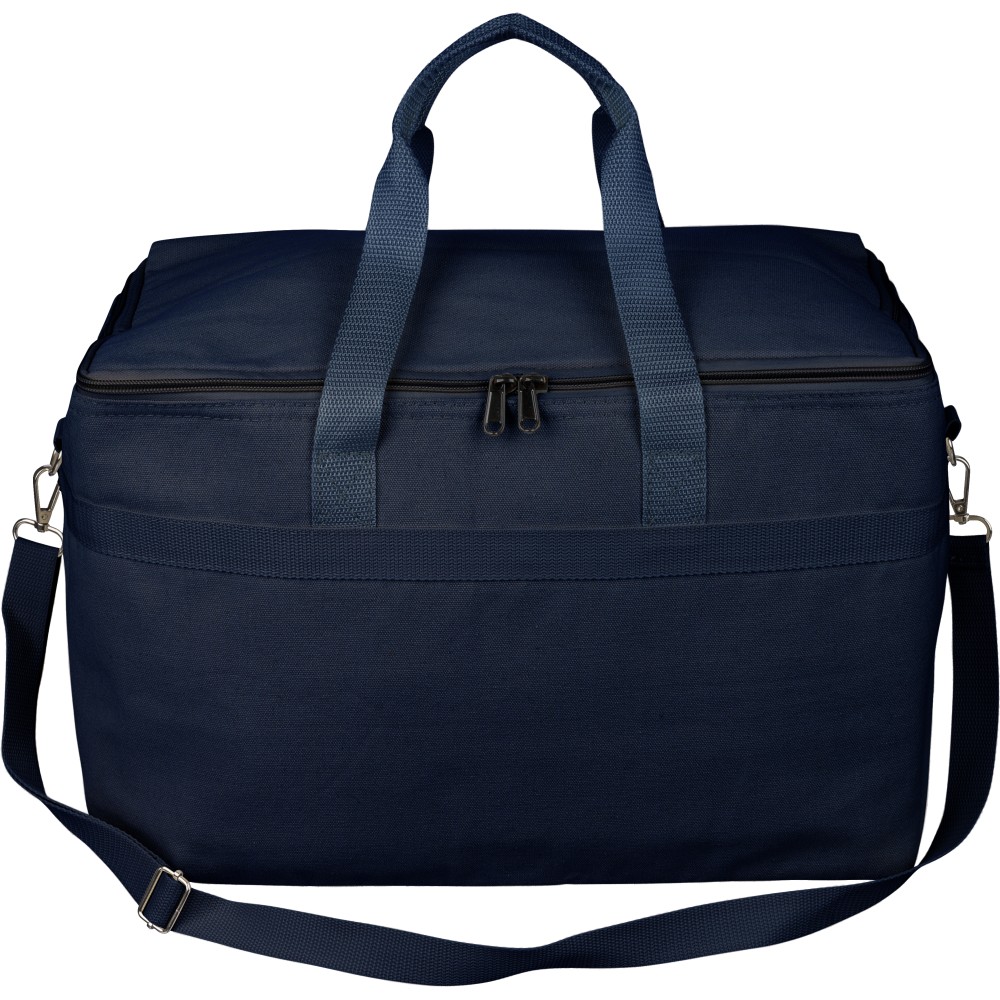 Újrahasznosított pamut-poliészter 330 g/m2 kevertszövetből készült hűtőtáska alumíniumfóliás szigeteléssel, 23 literes űrtartalommal. 60 cm hosszúságú és 3,5 cm szélességű fülekkel, 110 cm hosszúságú és 2,5 cm szélességű állítható vállpánttal, fémcsattal és a táska színével megegyező hevederrel rendelkezik. Külső felületén rPET címkével, belső részében további címkével ellátva.