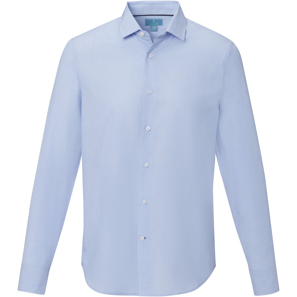 Férfi hosszúujjú ing. Fenntartható promóciós ruházat. Gravírozott gyöngyházfényű gombok. Állítható mandzsetta egy hajtással. Szatén szegés a belső nyakon. Kontrasztos színű varrások az ujjakon és az alsó gomblyukon. Szőtt címke. Poplin 100% minősített biopamutból, 121 g/m2.