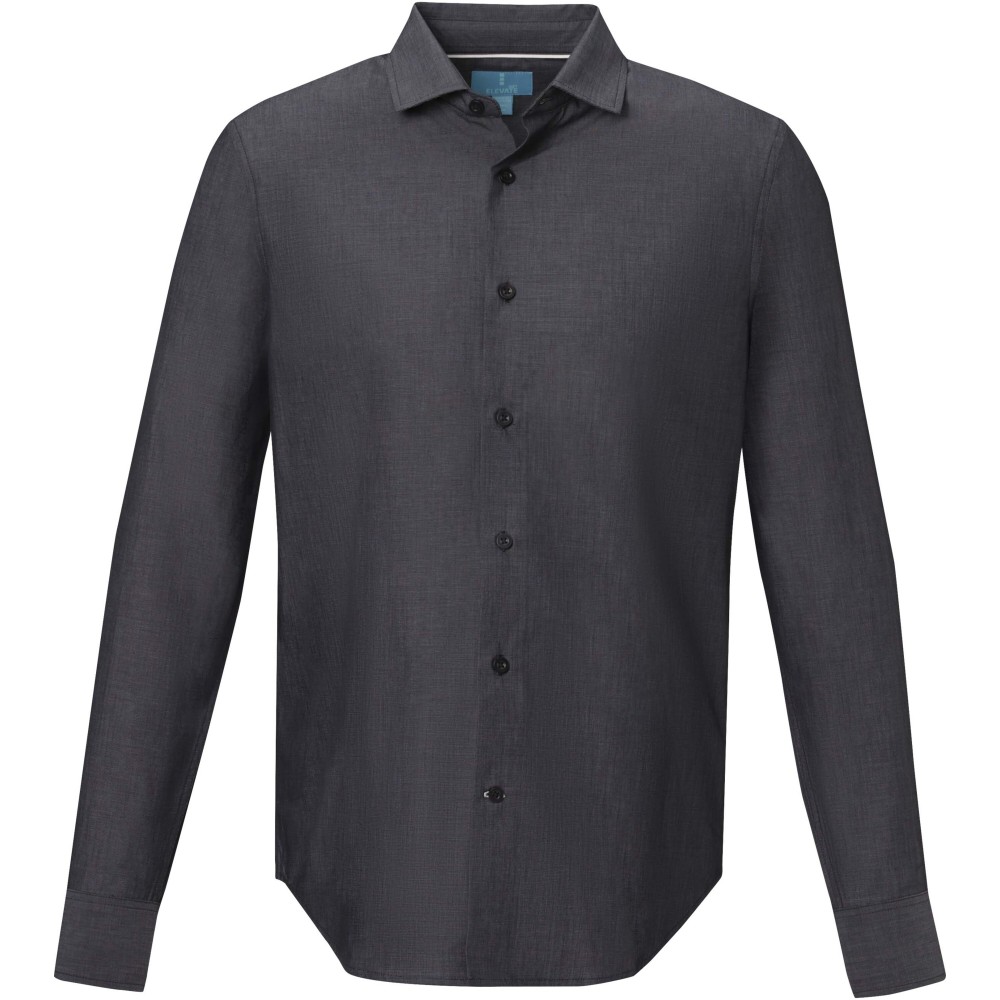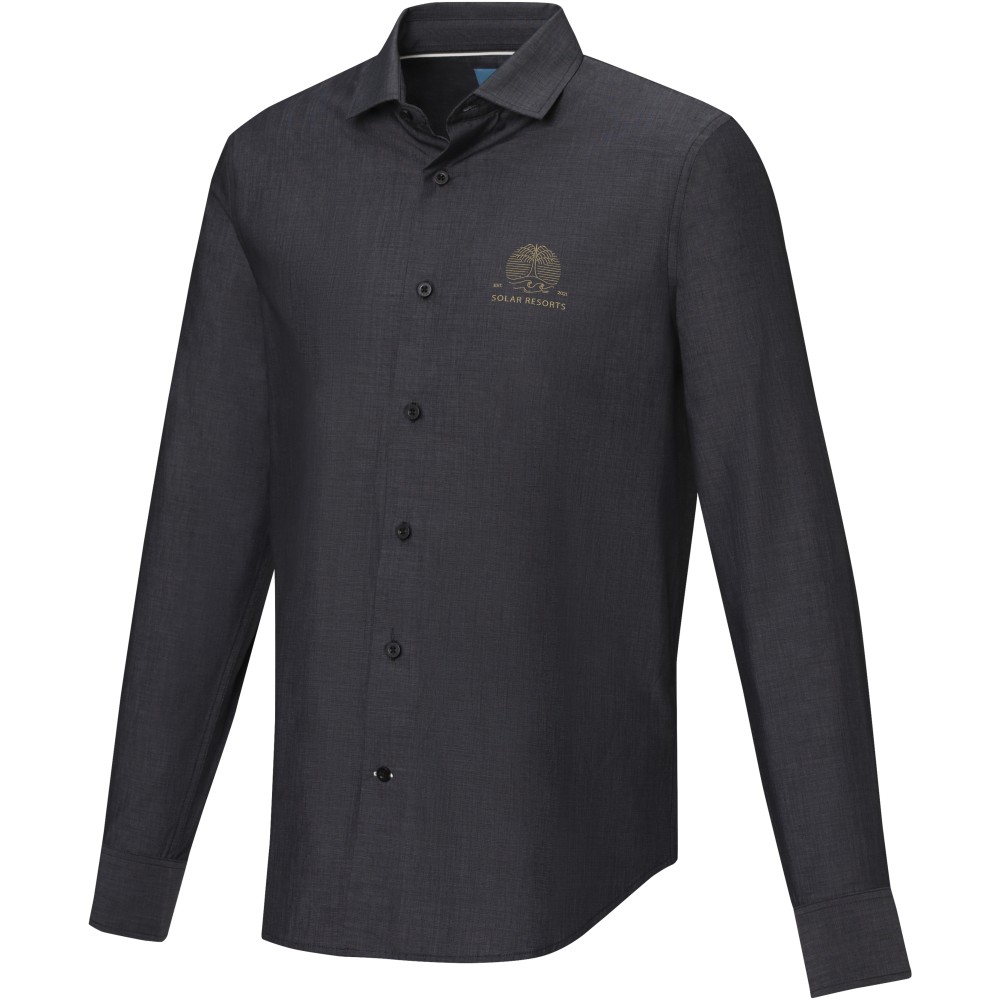 Férfi hosszúujjú ing. Fenntartható promóciós ruházat. Gravírozott gyöngyházfényű gombok. Állítható mandzsetta egy hajtással. Szatén szegés a belső nyakon. Kontrasztos színű varrások az ujjakon és az alsó gomblyukon. Szőtt címke. Poplin 100% minősített biopamutból, 121 g/m2.