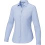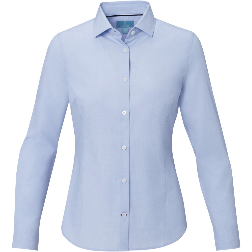 Női hosszúujjú blúz. Fenntartható promóciós ruházat. Gravírozott gyöngyházfényű gombok. Állítható mandzsetta egy hajtással. Szatén szegés a belső nyakon. Kontrasztos színű varrások az ujjakon és az alsó gomblyukon. Szőtt címke. Poplin 100% minősített biopamutból, 121 g/m2.