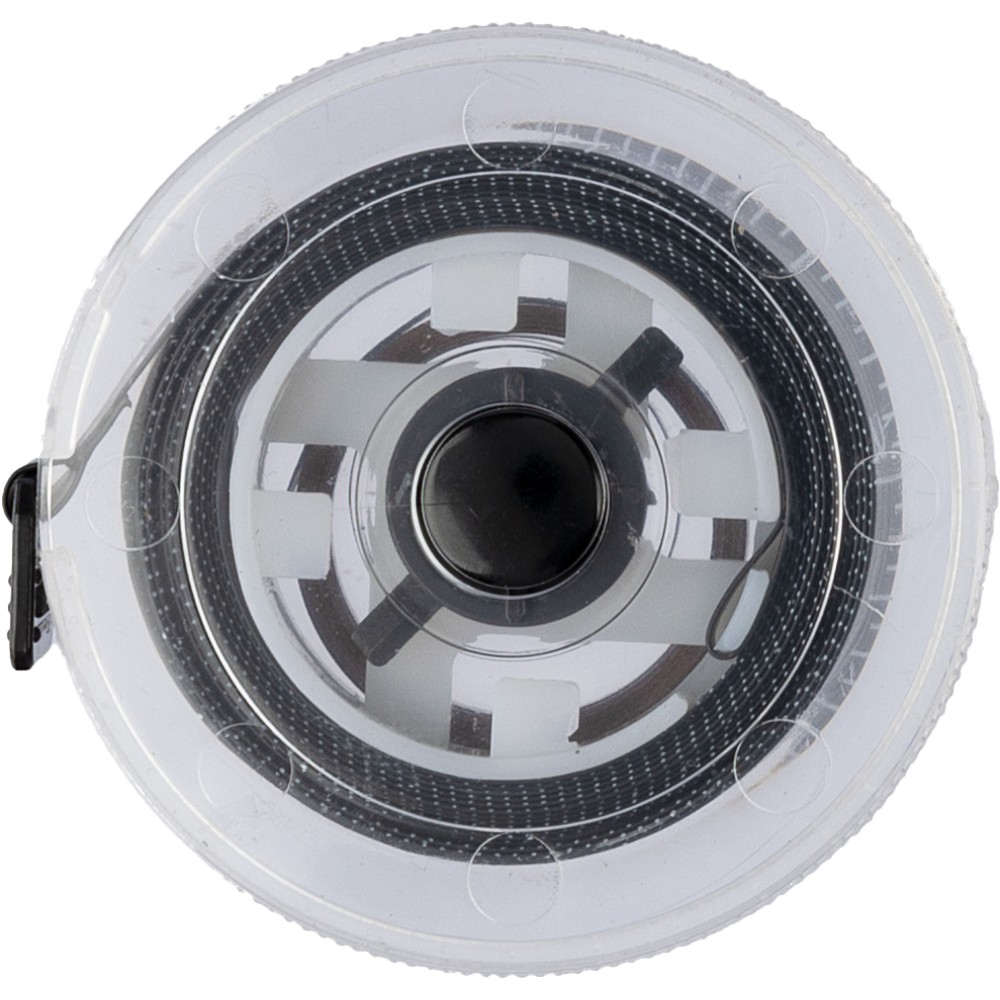 Mérőszalag átlátszó házzal és színes mérőszalaggal. Nyomógombbal és reteszelő mechanizmussal rendelkezik. A nyomtatási terület a hátoldal sík felületén található. 1,5 méter.