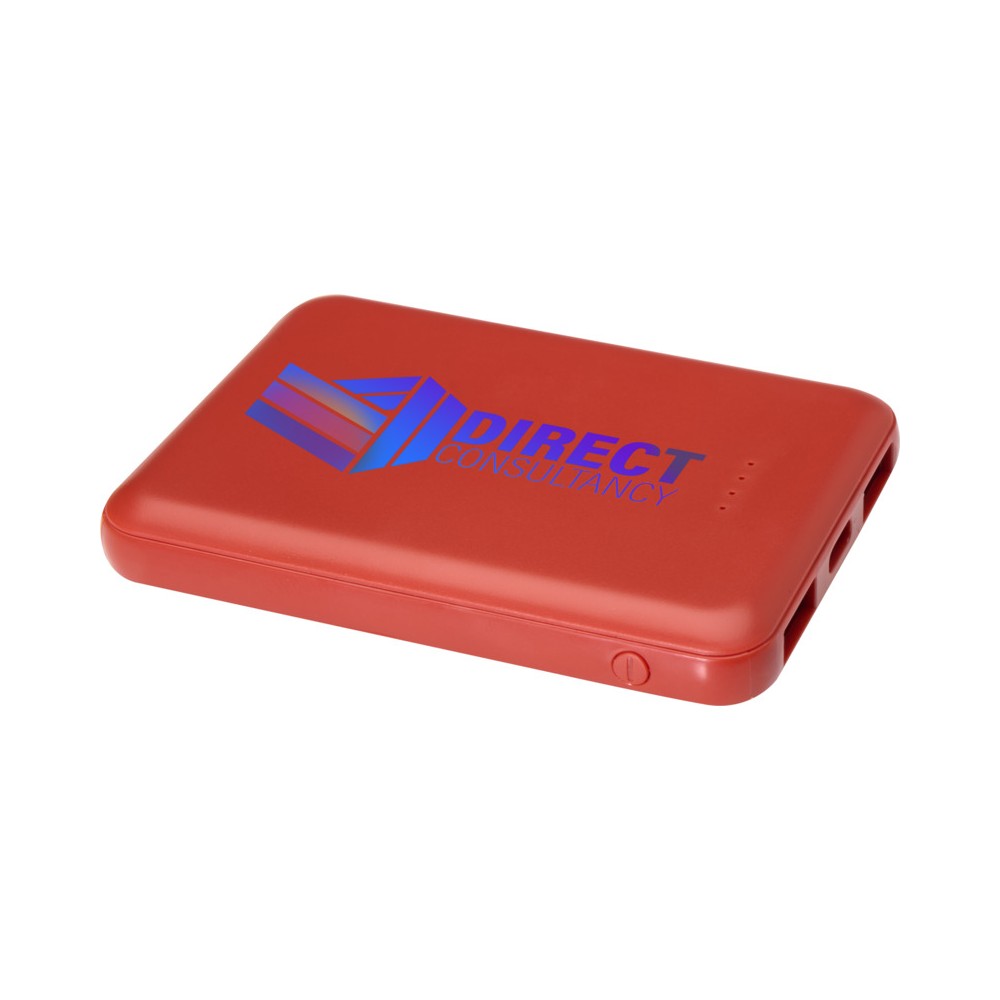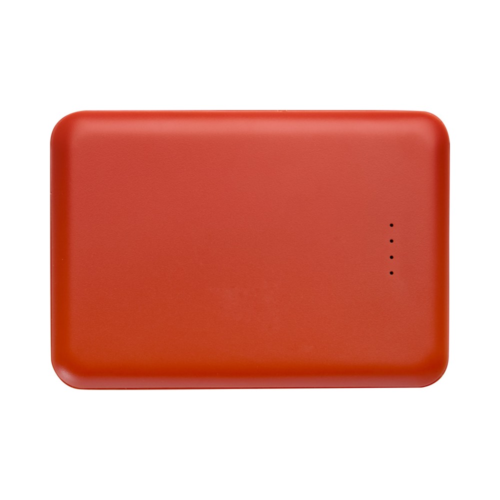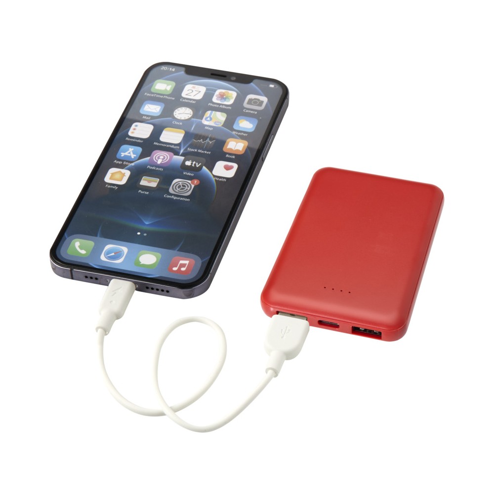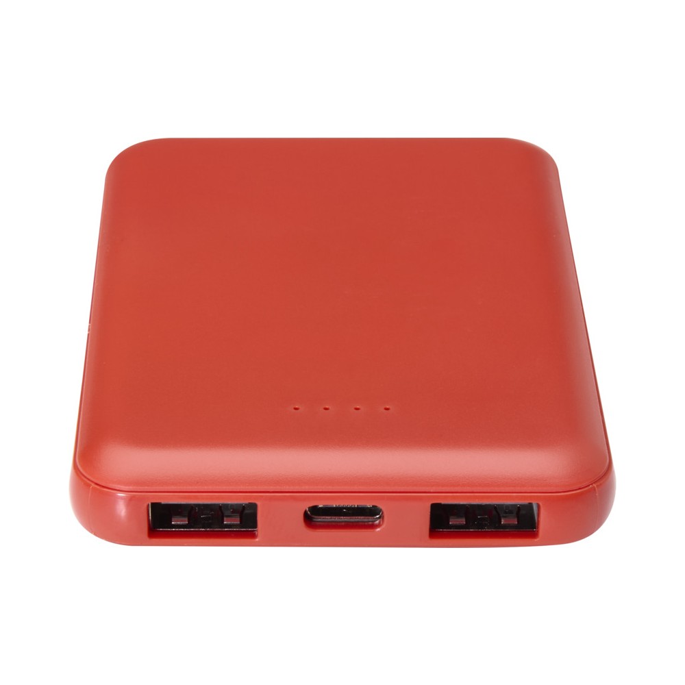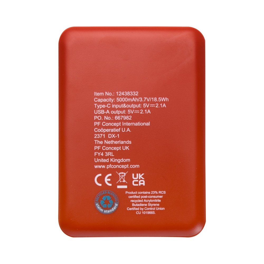 Karcsú és elegáns kialakítású powerbank, Type-C bemeneti/kimeneti porttal és 2 db USB-A porttal, amelyek lehetővé teszik három eszköz egyidejű töltését. A powerbank 5000 mAh kapacitású lítium-polimer akkumulátorral rendelkezik, amely max. 10W teljesítményt biztosít. A powerbank 23%-ban RCS tanúsítvánnyal rendelkező újrahasznosított műanyagból készült. TPE Type-C - USB-A töltőkábellel szállítjuk.