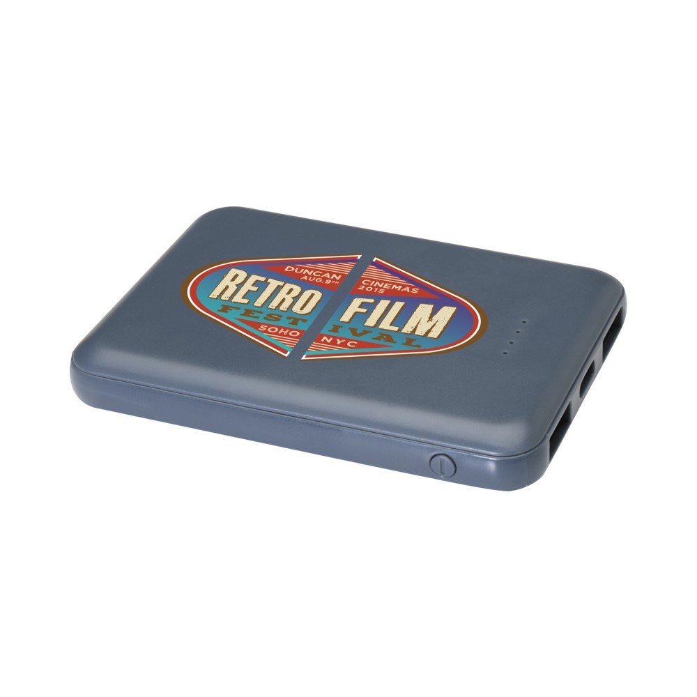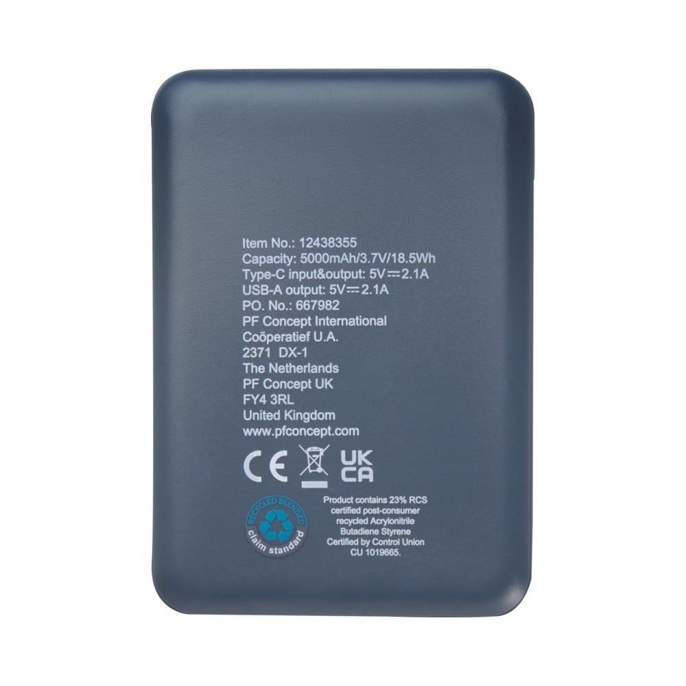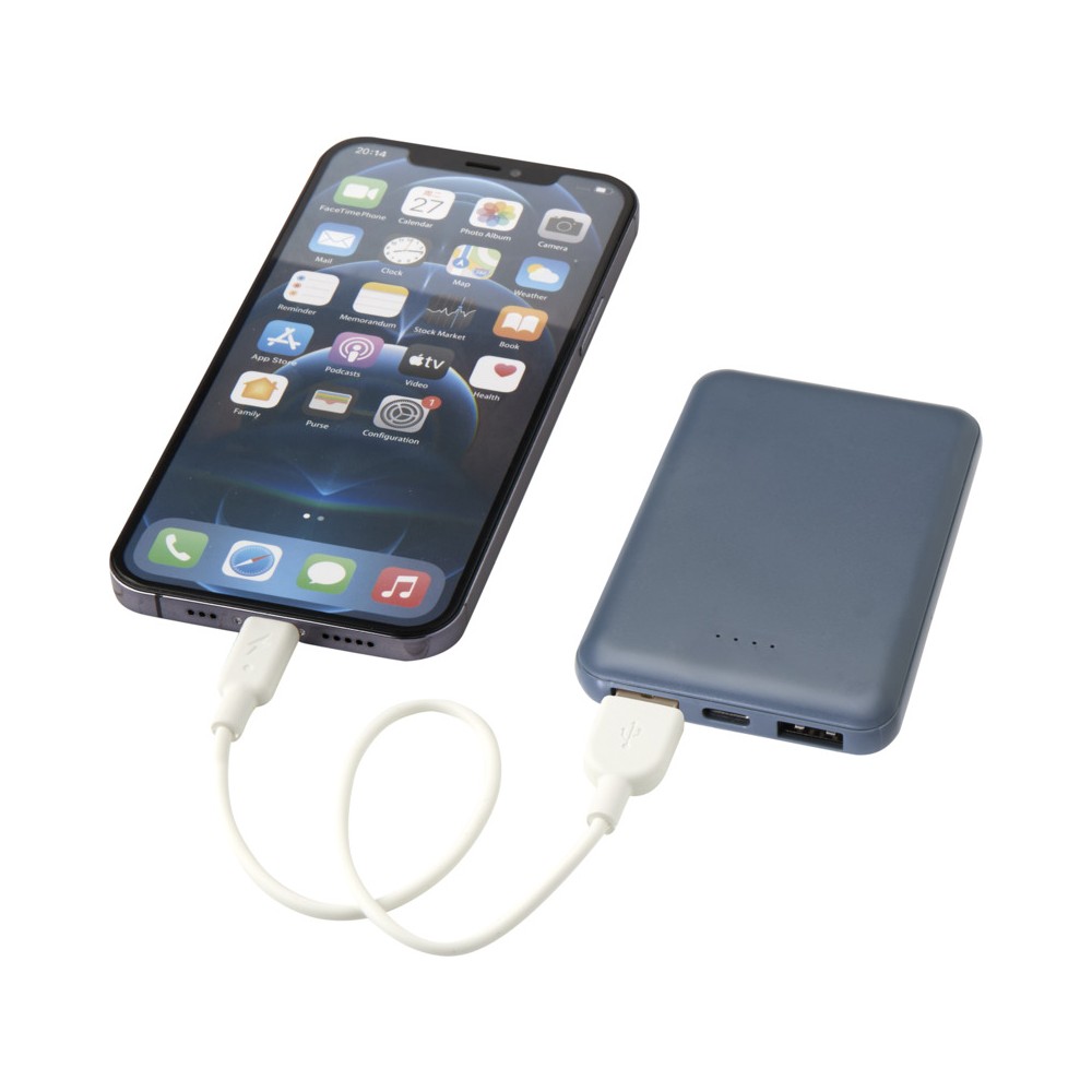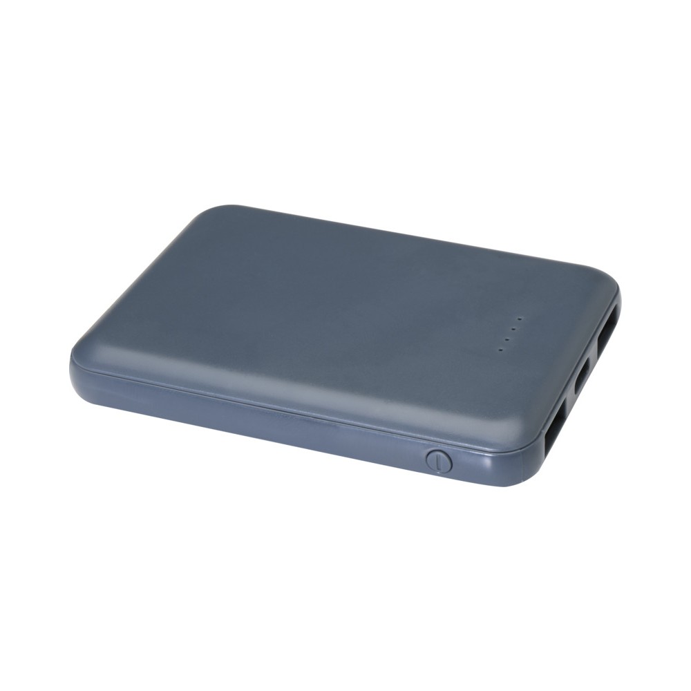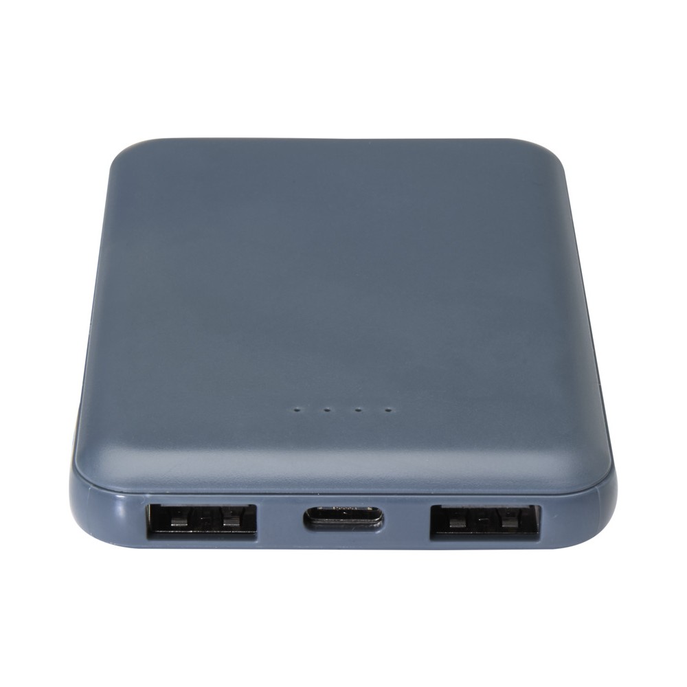 Karcsú és elegáns kialakítású powerbank, Type-C bemeneti/kimeneti porttal és 2 db USB-A porttal, amelyek lehetővé teszik három eszköz egyidejű töltését. A powerbank 5000 mAh kapacitású lítium-polimer akkumulátorral rendelkezik, amely max. 10W teljesítményt biztosít. A powerbank 23%-ban RCS tanúsítvánnyal rendelkező újrahasznosított műanyagból készült. TPE Type-C - USB-A töltőkábellel szállítjuk.