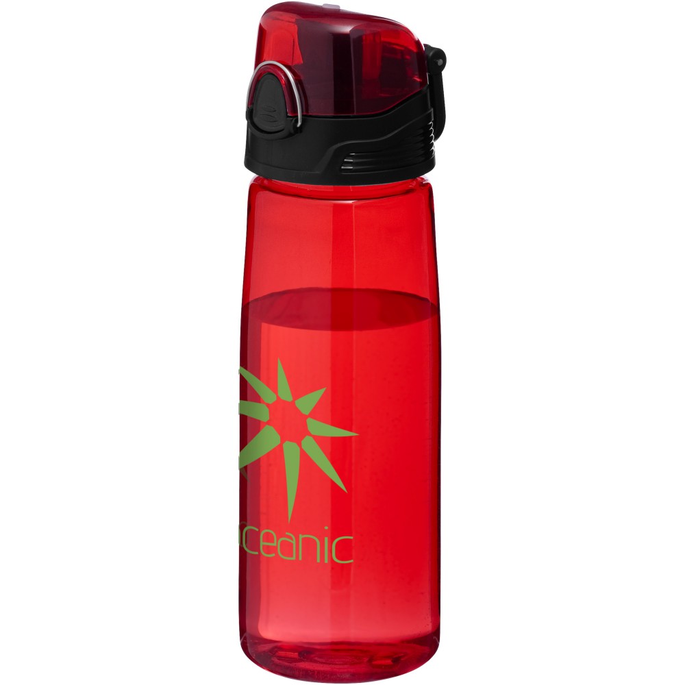 Nagy melegben a könnyű Capri sportpalack életmentő lehet. A palacknak felnyitható ivófedele van kifolyóval, így védve és tisztán tartja. A nyomógomb megkönnyíti a nyitást. Az átlátszó palack szilárd folt- és szagmentes Eastman Tritan anyagból készült, így tartós és BPA-mentes. Szivárgásmentes. Szénsavas italokkal nem használható. Mosogatógépben nem mosható és mikrohullámú sütőben történő melegítésre nem alkalmas. Űrtartalom: 700 ml.