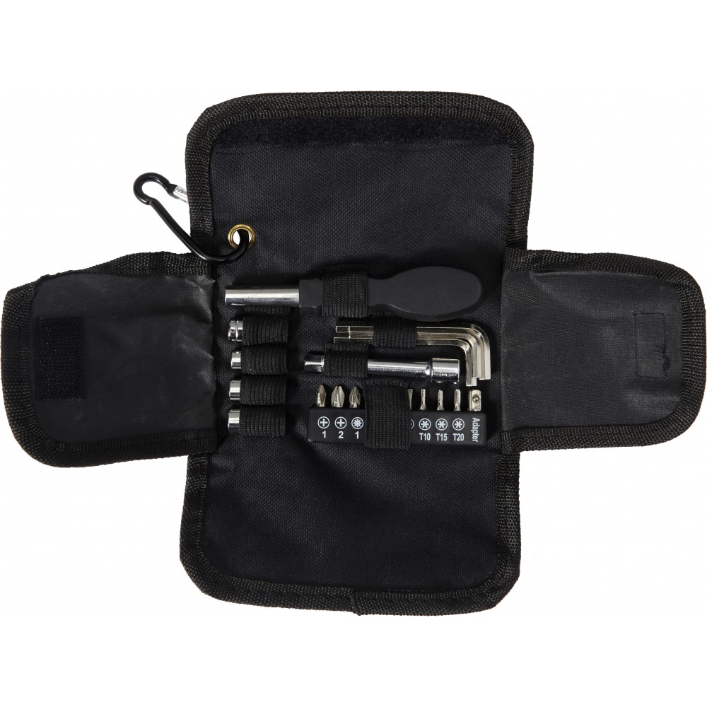 20 darabos szerszámkészlet 600D oxford anyagú tartóban, tépőzáras záródással, karabineres akasztóval. A táska tartalma: csavarhúzó, 3 db hex kulcs, 4 db befogófej, 10 db csavarhegy, 1 db hosszabbító nyél.