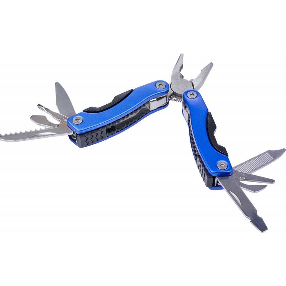 Kompakt multifunkciós szerszám. Funkciók: csavarhúzók (laposfejű és Phillips), reszelő, fűrész, kés, diótörő, doboznyitó és üvegnyitó. Alumínium, rozsdamentes acél