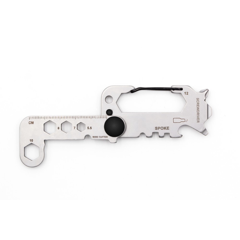 Az edzett 420-as martenzites rozsdamentes acélból készült Twist többfunkciós szerszám bicikliseknek is. 8 alapvető szerszámot egyesít egy kompakt csavaros kialakításban, amely kényelmesen illeszkedik a kezedbe. Ez a sokoldalú eszköz tartalmaz egy drótvágót, kerékpárküllős csavarkulcsot, több villáskulcsot (5,5-12 mm), kulcstartót, sörnyitót, karabinerkampót, csillagfejű és lapos csavarhúzókat, valamint egy vonalzót. Fekete dobozba csomagolva puha habszivacs betéttel a védelem érdekében, egyszerre elegáns és praktikus, ideális a mindennapi feladatokhoz.