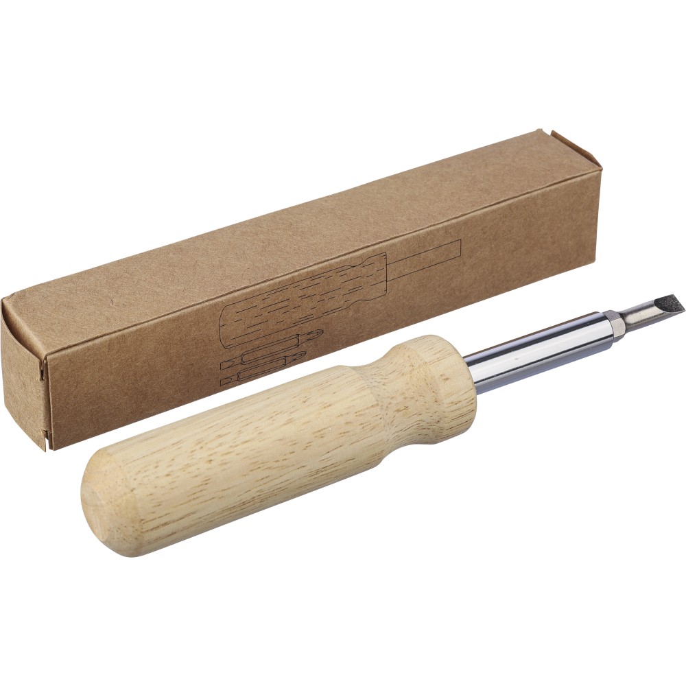 Kaucsukfa csavarhúzó készlet a nyélben tartható 4 db mágneses fejjel (2-2 db mindegyik kétoldalas hegyen). Praktikus és kompakt kialakítás cserélhető fejekkel és tartóval. Csomagolása barna papírdoboz.