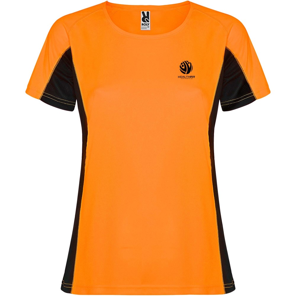 Roly Shanghai rövid ujjú női sportpóló, fluor orange, solid black