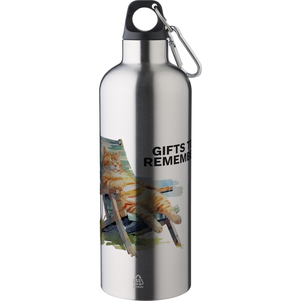 Újrahasznosított rozsdamentes acélból készült 500 ml-es palack PP kupakkal és alumínium karabinerrel. A kulacs a benne tárolt italt 8 órán át melegen, 12 órán át pedig hidegen tartja. Az ezüst szín kivételével külső felülete matt. Az újrahasznosított anyagra utaló logó a palackra van gravírozva. Mosogatógépben nem tisztítható. Csomagolása barna papírdoboz.