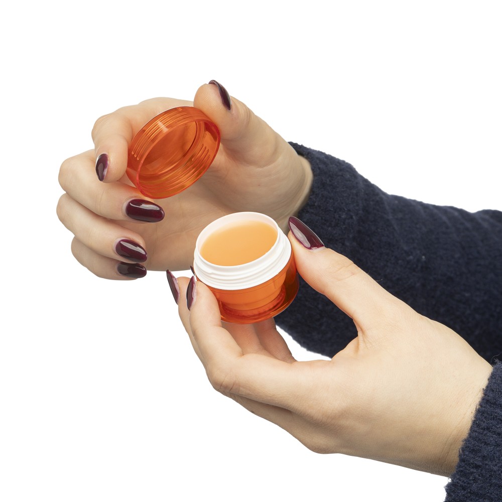 AS anyagból készült színes, áttetsző tégely, benne 12 g ajakbalzsammal. Az ajakír színe megegyezik a tégely színével, négyféle illatban elérhető: vanília (21), eper (08), narancs (07) és áfonya (24).