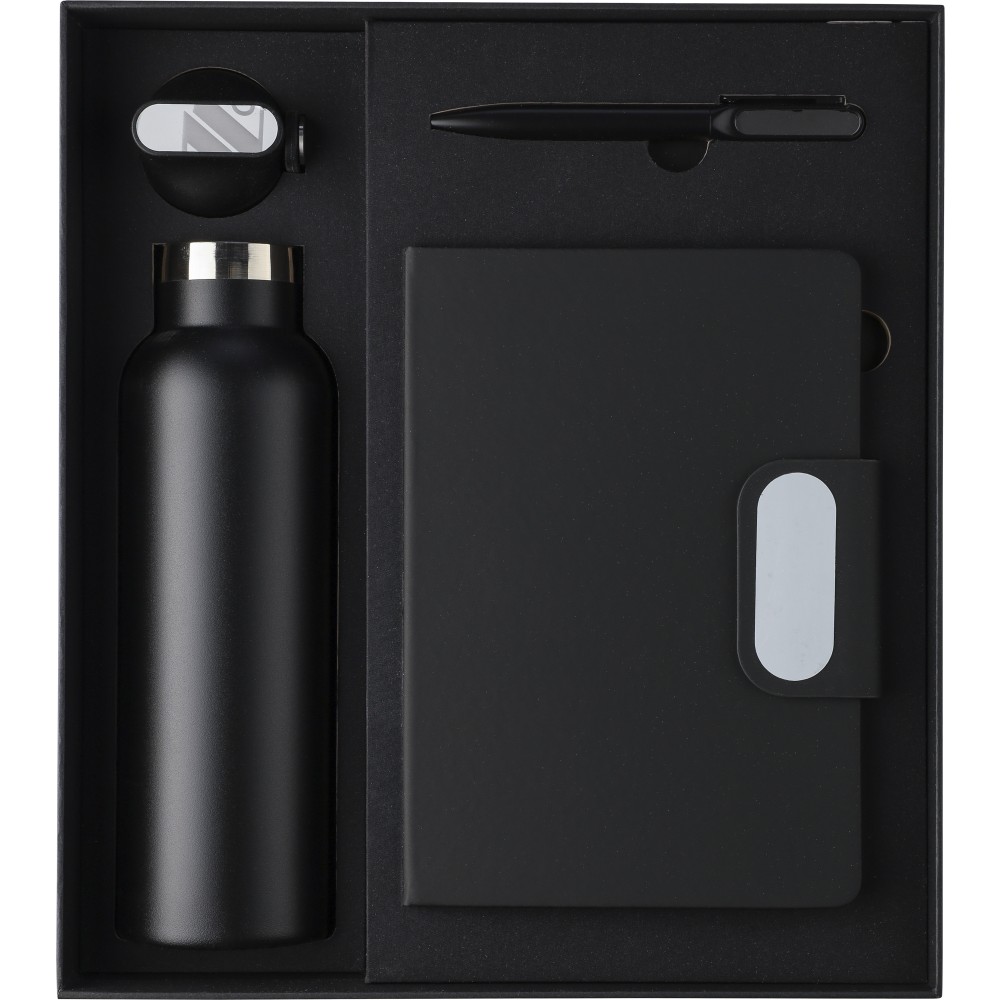 Karton ajándékkészlet duplafalú, újrahasznosított rozsdamentes acél kulaccsal (304 belül és kívül) szilikon fogantyúval, újrahasznosított alumínium csavaros golyóstollal (kék tintával), és újrahasznosított PU jegyzetfüzettel. A jegyzetfüzet 80 lapos, 70 g/m2-es vonalas lapokból áll, szalagos könyvjelzőt és fém mágneses zárat tartalmaz fegyveracél gravírozott lemezzel. Minden termék újrahasznosított logóval van ellátva.