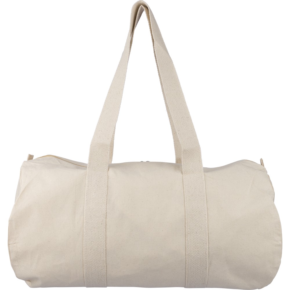 Oeko-Tex minősítésű, 180 g/m2 pamutból készült natúr színű, cipzáras sporttáska 60 cm hosszúságú és 5 cm szélességű pamutfülekkel. Oeko-Tex címkével ellátva.